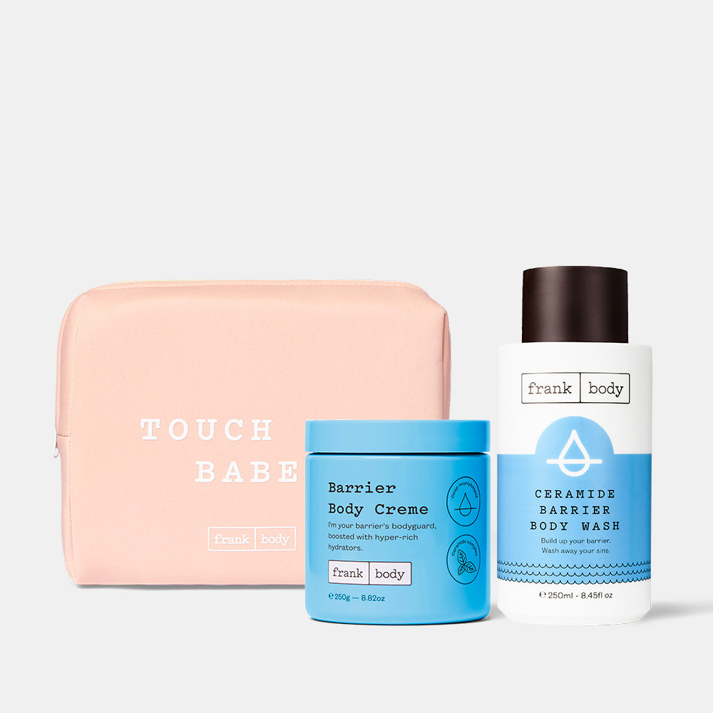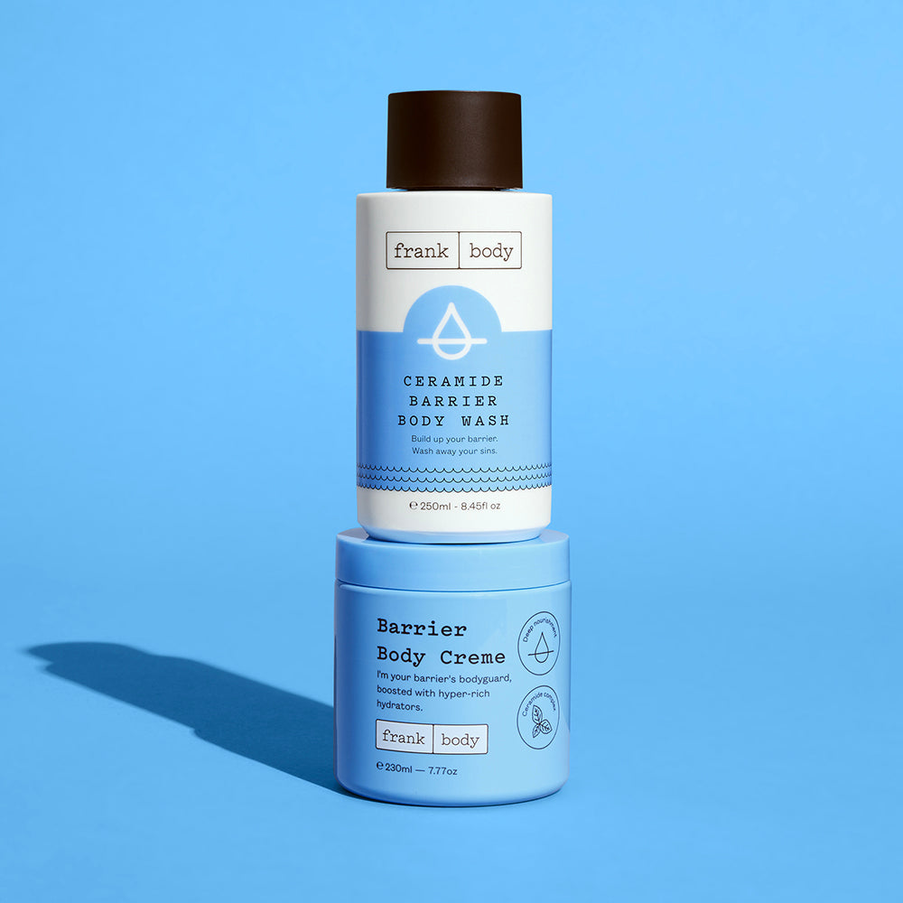Whether you’re feeling bone-dry, or the skin’s acting a little bitchy. My Barrier Bodyguards Kit protects you from the weather, and soothingly relieves the itchy. Ceramides bulk up your barrier. Jojoba oil is omega-rich. And vitamin B5 protects and serves. Lusciously foam up the wash, then lather on the creme to seal in the cracks. From the bottom (layer) to the top, I’m your personal nourisher, bouncer, protector. No buff, but all tough — bring in my barrier bodyguards.