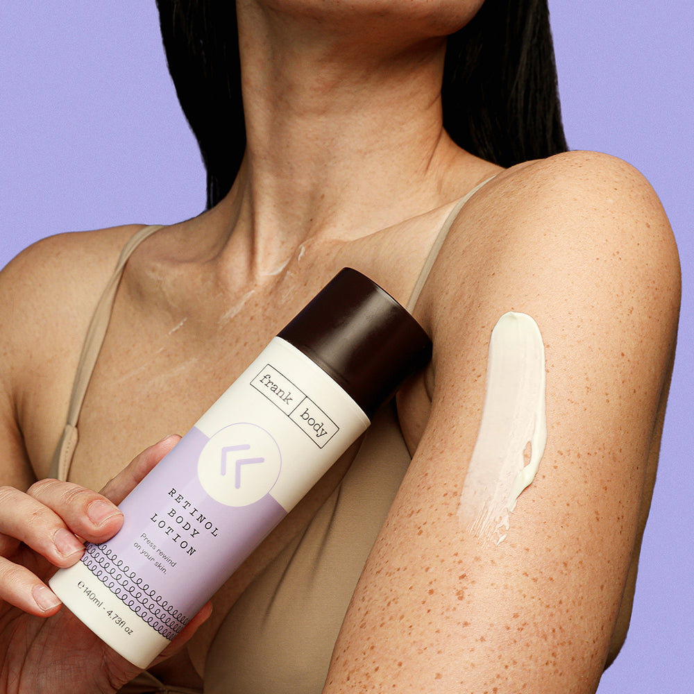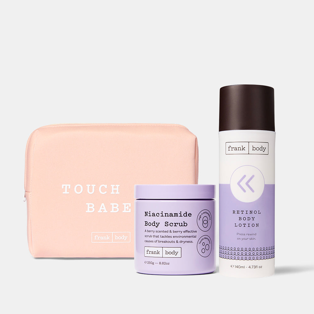 When your skins got jet lag and you didn't even get to the Bahamas. Dryness, fine lines, uneven tone — it'll drive you bananas. This future-proofing Rewind Body Duo is filled with berry extracts for an antioxidant boost, but my Retinol Body Lotion packs a punch as a resurfacing treatment for crepey, tired skin. Alternate it with my Niacinamide Body Scrub for a smoothing, calming, and plumping hit.